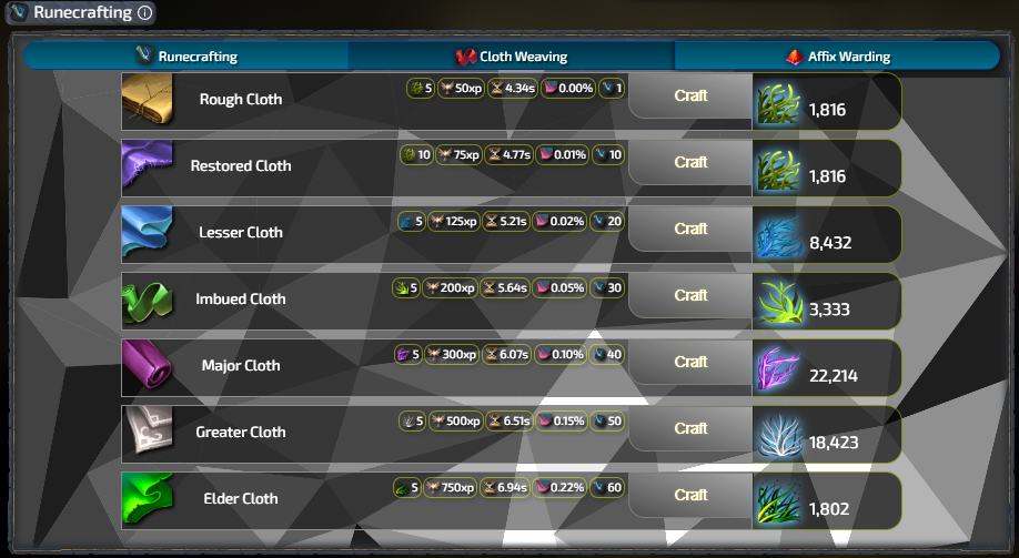 Cloth Weaving is a subskill of Runecrafting Runecrafting. Each cloth type corresponds to a more-powerful Magic equipment set, and generally requires harder to obtain fibers. Each Cloth Weaving action has a small chance of producing an additional Ancient Cloth Fragment. This chance scales with the tier of cloth produced and effective Runecrafting level.
